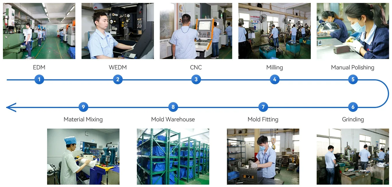 Mold Production involves mold design, material selection, machining, assembly, and testing for mass production